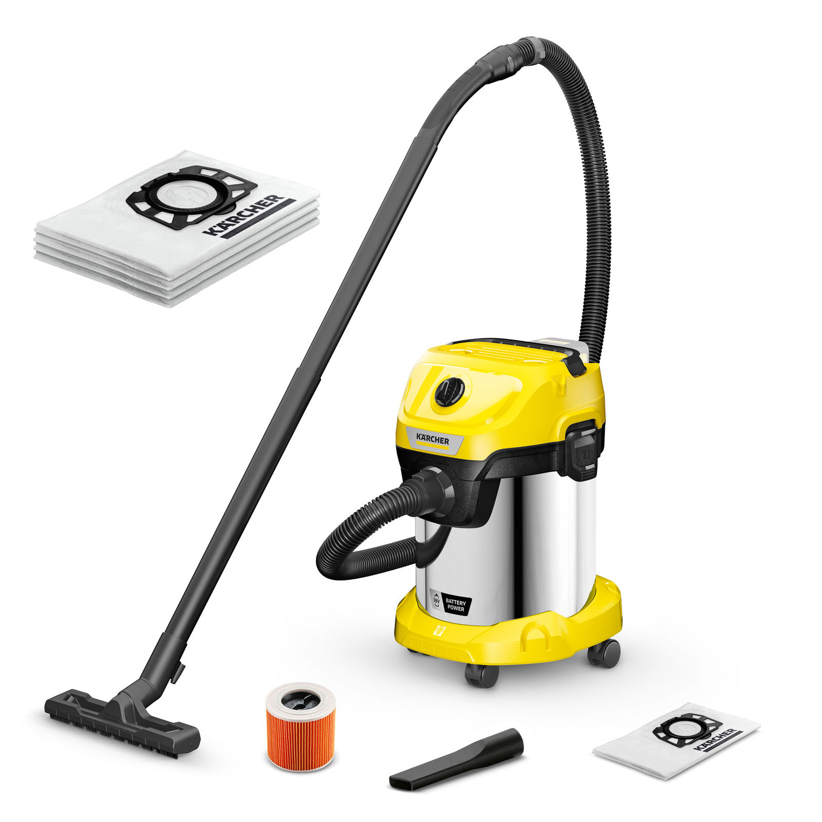Ohne Kabel, aber inkl. Akku, 17-l-Edelstahlbehälter und Zubehören für mehr Flexibilität: der Akku-Nass-/Trockensauger WD 3 Battery Premium Set aus der 36 V Battery Power Akku-Plattform. Im WD 3 Battery Premium Set ist der Akku mit einer Laufzeit von 15 Minuten schon mit drin – damit man gleich losgehen kann. Dabei wird der Akkustatus immer auf dem LCD-Display des Akkus angezeigt. Der akkubetriebene und saugstarke Nass-/Trockensauger enthält in der Premium-Variante einen robusten und stoßfesten Edelstahlbehälter. Unabhängig vom Stromnetz bietet er die volle Funktionalität eines Nass-/Trockensaugers. Der strömungsoptimierte Saugschlauch sowie die clevere Clips-Bodendüse mit Mischeinsatz verbessern die Schmutzaufnahme und ermöglichen restlose Sauberkeit. Dank Patronenfilter lässt sich trockener und nasser Schmutz ganz ohne Filterwechsel bequem aufsaugen. Ebenfalls inklusive: Blasfunktion, abnehmbarer Handgriff für eine direkte Zubehöranbringung, Parkposition für Saugrohr und Bodendüse, „Pull ’n’ Push“-Verschlusssystem, ergonomischer Tragegriff und die äußerst praktische Zubehöraufbewahrung. Der WD 3 Battery Premium Set ist Teil der 36 V Battery Power Plattform, wodurch sein Akku auch in anderen 36 V Akku-Plattform Geräten eingesetzt werden kann - für noch mehr Flexibilität. Merkmale & Vorteile 36 V Kärcher Battery Power-Wechselakku Ermöglicht das Arbeiten unabhängig vom Stromnetz und schafft so die maximale Bewegungsfreiheit. Real Time Technology mit LCD-Akkudisplay: Restlaufzeit, Restladezeit und Akkukapazität. Kompatibel mit allen Geräten der 36 V Kärcher Battery Power-Plattform. Spezieller Patronenfilter Für Nass- und Trockensaugen ohne Filterwechsel. Praktische Blasfunktion Überall dort, wo Saugen nicht möglich ist, hilft die praktische Blasfunktion. Mühelose Schmutzentfernung zum Beispiel aus einem Kiesbeet. Bodendüse und Saugschlauch Für bestes Reinigungsergebnis, egal ob trockener oder nasser, feiner oder grober Schmutz. Für höchsten Arbeitskomfort und Flexibilität beim Saugen. Abnehmbarer Handgriff Bietet die Möglichkeit, verschiedene Düsen direkt auf den Saugschlauch zu stecken. Für einfachstes Saugen auch auf engsten Räumen. Praktische Parkposition Bei Arbeitsunterbrechungen bequemes sowie schnelles Zwischenparken von Saugrohr und Bodendüse. Praktische Zubehöraufbewahrung Platzsparende, sichere und griffbereite Aufbewahrung von Saugschlauch und Zubehör. Gerät, Saugschlauch und Bodendüse sind optimal aufeinander abgestimmt Für bestes Reinigungsergebnis, egal ob trockener oder nasser, feiner oder grober Schmutz. Für höchsten Arbeitskomfort und Flexibilität beim Saugen. „Pull & Push“-Verschlusssystem Zum leichten, schnellen und sicheren Öffnen und Schließen des Behälters. Ergonomisch geformter Tragegriff Ermöglicht komfortablen Transport des Gerätes. Große Transportrollen Für den sicheren und komfortablen Transport auch auf unwegsamem Terrain wie bspw. Gartenwegen.